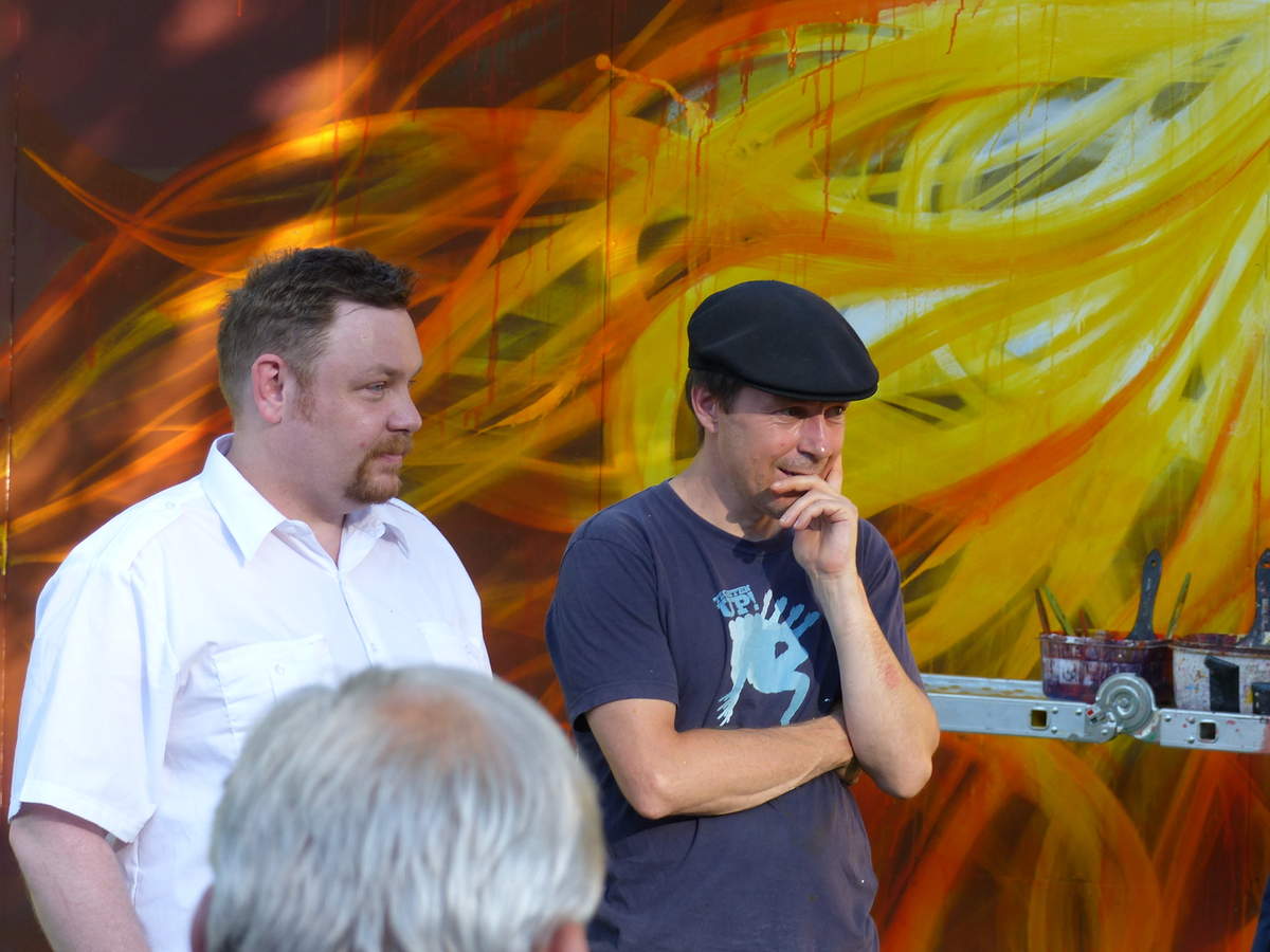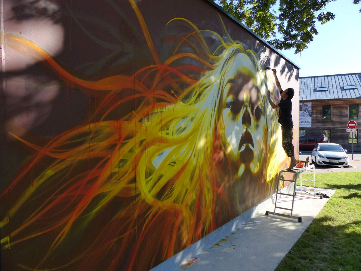 Avec l’association « Le Mur » dont le président Tomtom était exceptionnellement présent, Christophe Petit a lancé la Fête des Images jeudi dernier devant la Plomberie, rue Saint Michel, en inaugurant officiellement l’œuvre de l’artiste Dan23 devant une cinquantaine d’amateurs d’art urbain. Une production éphémère (durée de vie de 2 mois), rayonnante et séduisante qui n’a déçu personne, et qui a été réalisée dans la chaleur d’un soleil ardant mais à l’ombre des tilleuls.