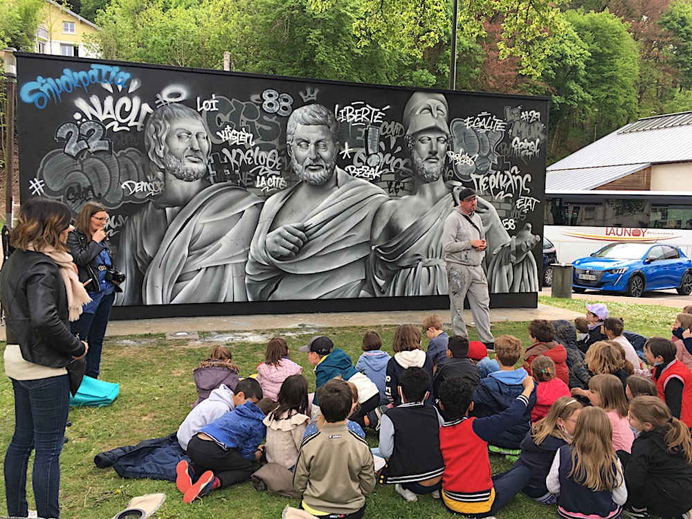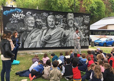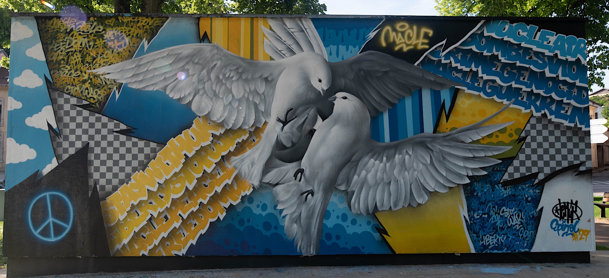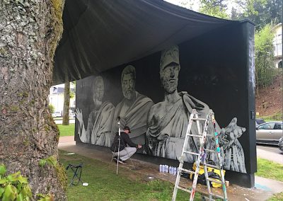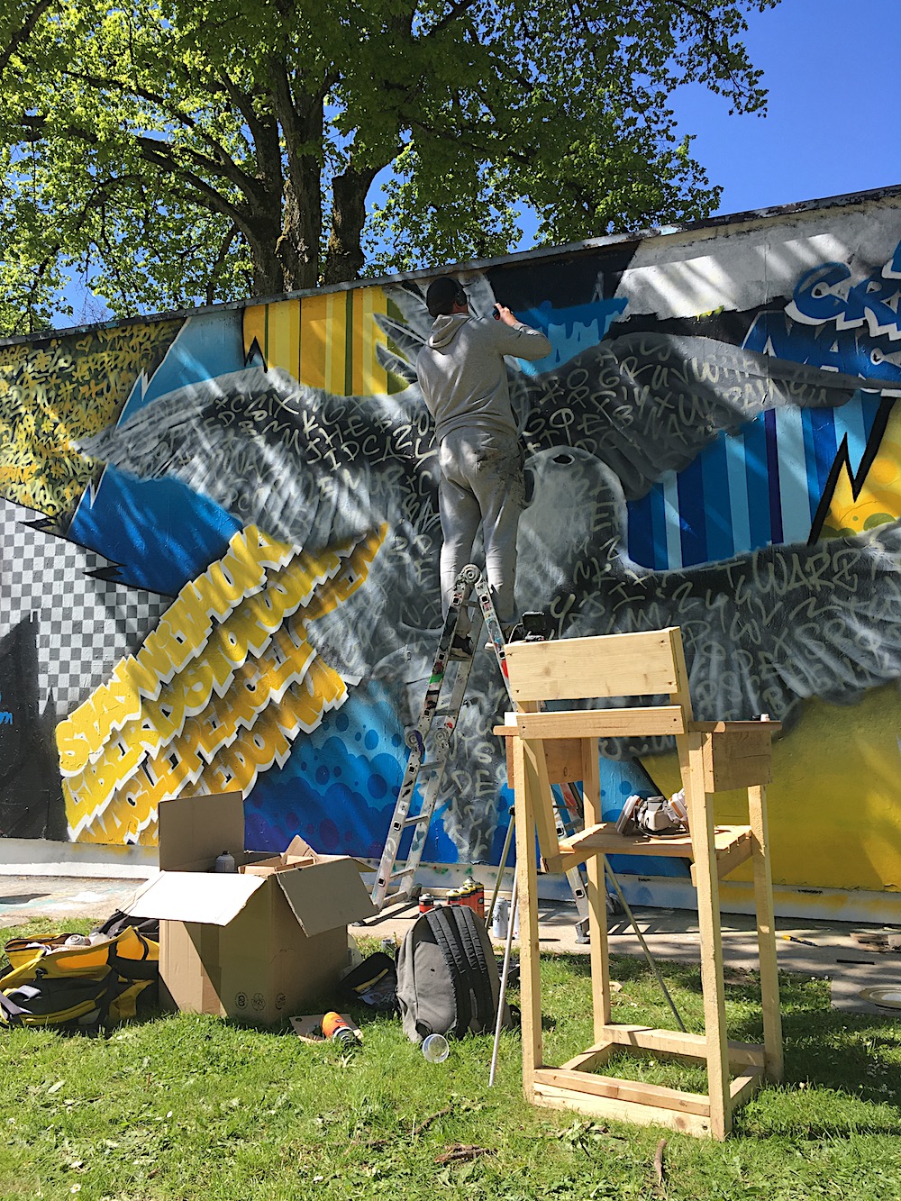 L’artiste a ses propres codes, sa propre méthode bien connue dans le paysage urbain bisontin : des personnages peints en différentes nuances de gris. « En 7 nuances de gris, de la plus foncée à la plus claire, rehaussée avec un peu de noir et de blanc », précise NaCle. « Et pour les fonds, je travaille tout à l’aérosol, avec pas mal de couleurs. J’essaye d’en transporter dans ma nacelle à peu près 80 tous les jours, pour pouvoir travailler un maximum de couleurs, et offrir un peu de gaieté aux gens », poursuit-il.