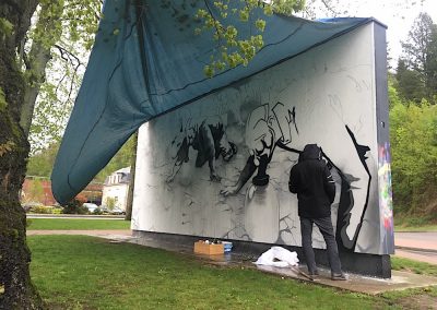 À partir de 2009 il réinvestit officiellement la rue autour d’un travail intense de pochoirs et d’encollage de sérigraphies.