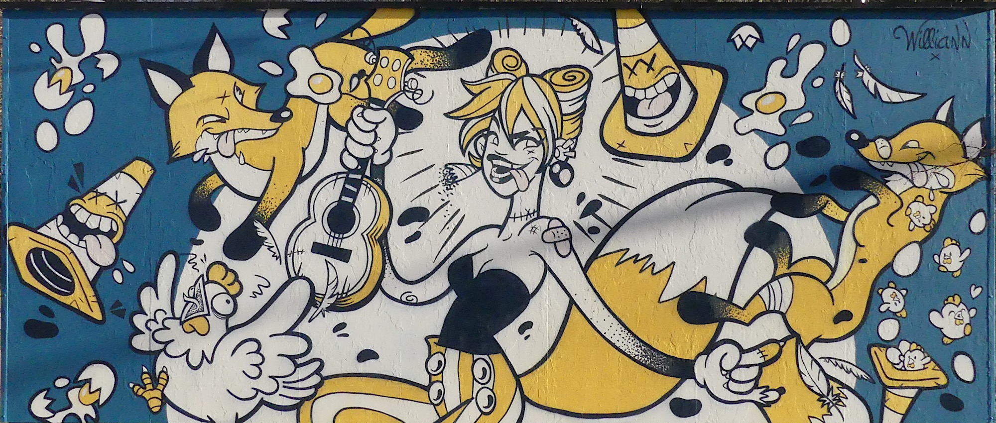 Une fresque haute en couleur, peuplée de renards, des plots routiers humanisés et de coquottes effarouchées.